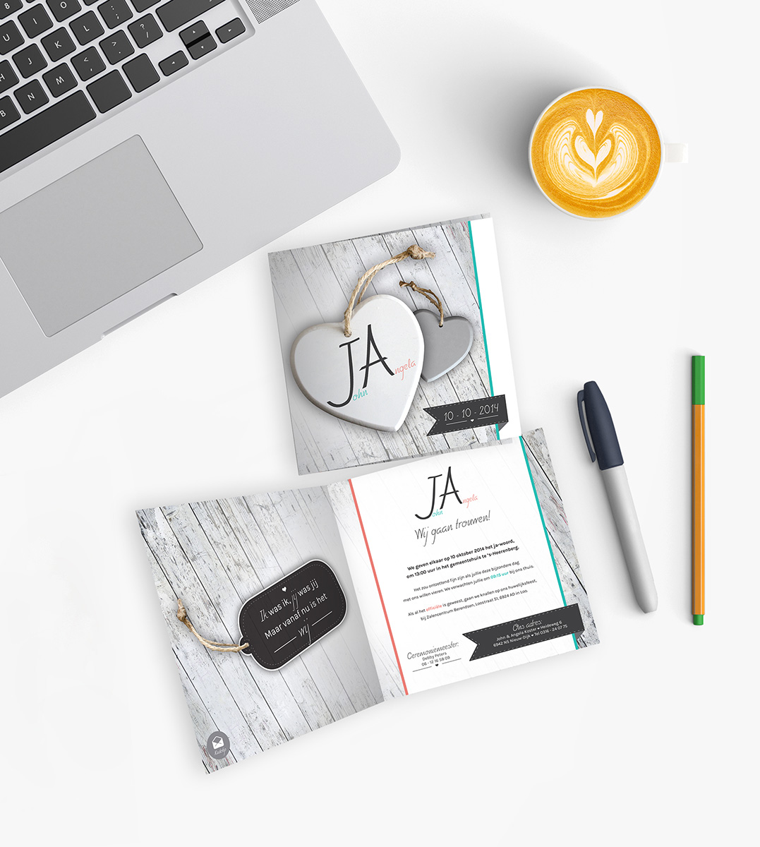 Ontwerp en realisatie van de trouwkaart. Één voorkant, twee versies binnenwerk: dag- en avondgasten....